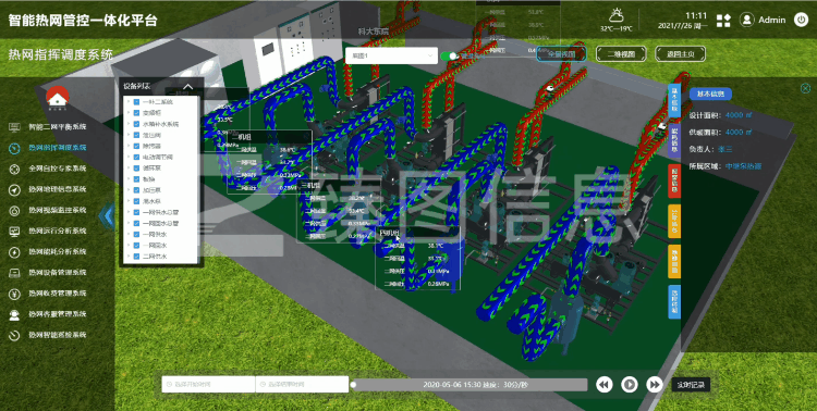 2、基于ZTMAP 3DGIS模型,结合热力站数据、天气预报、居民用户反馈,消除冷热不均,最大限度地减少人工干预调节,达到全网水力热力平衡,实现生产、运营智能化,提高供热安全。生产调度中心的视频监控系统、热网参数监控系统,远程实时监测热力站内情况和运行数据,调度人员可随时随地获知热网运行状态。